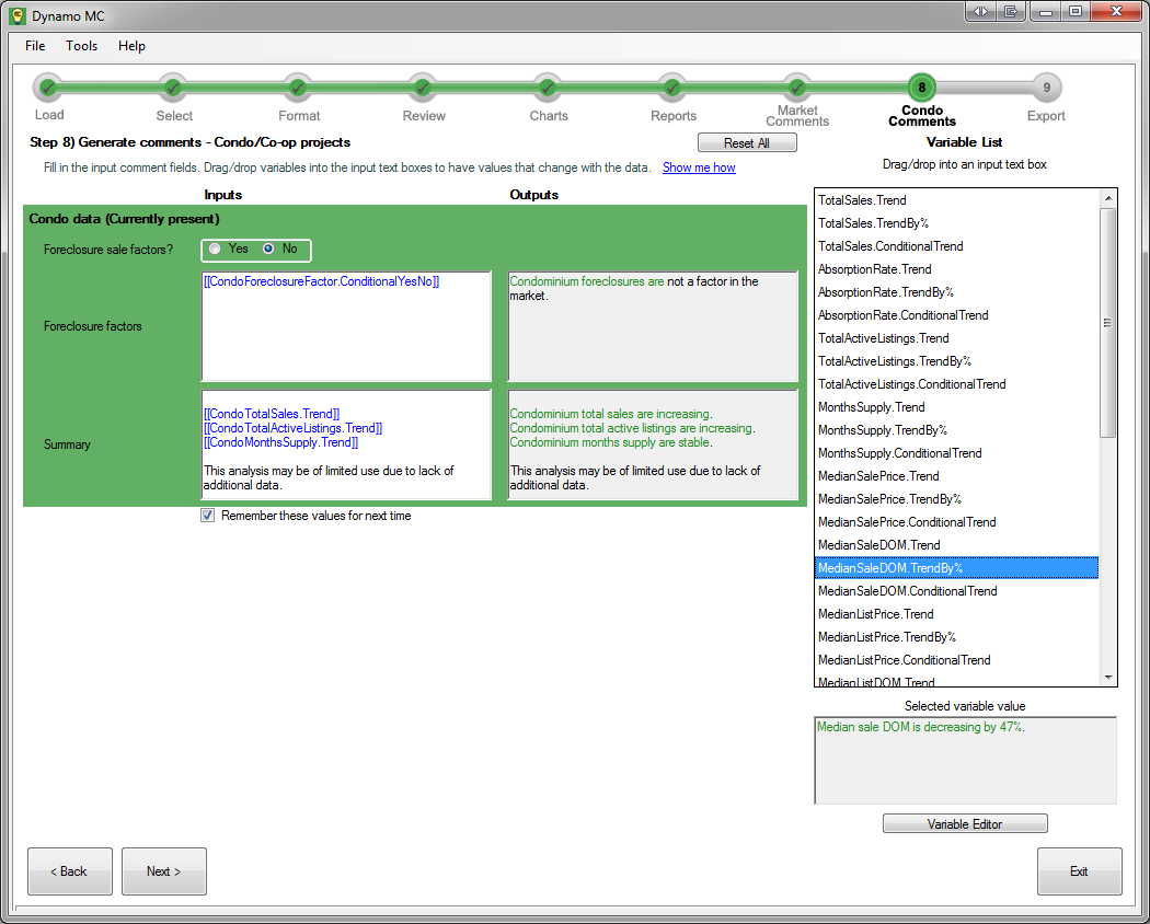 - Dynamically generates comments. No other solution on the market offers you the power to automate your 1004MC comments like Dynamo MC™. This feature lets your comments remain accurate as the data changes. A powerful editor allows you to customize what your comments say as the data trends change without having to edit them each time. ( Always inspect the comments and add what is needed manually to ensure you are in compliance with USPAP. No application can ever replace an appraiser’s expertise.)