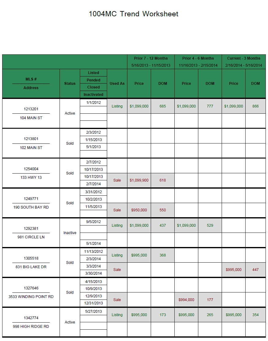 - Recognizes old listings. Appraisers know that older listings (prior to a year before the effective date) can be easy to miss in most MLS systems. Dynamo MC™ can consider older comparable properties that were listed long ago, but still remained active during the relevant time period. Just extend your comparable search backwards in time, and import your results. Dynamo MC™ will automatically include or exclude these listings in your analysis based on the relevant dates.