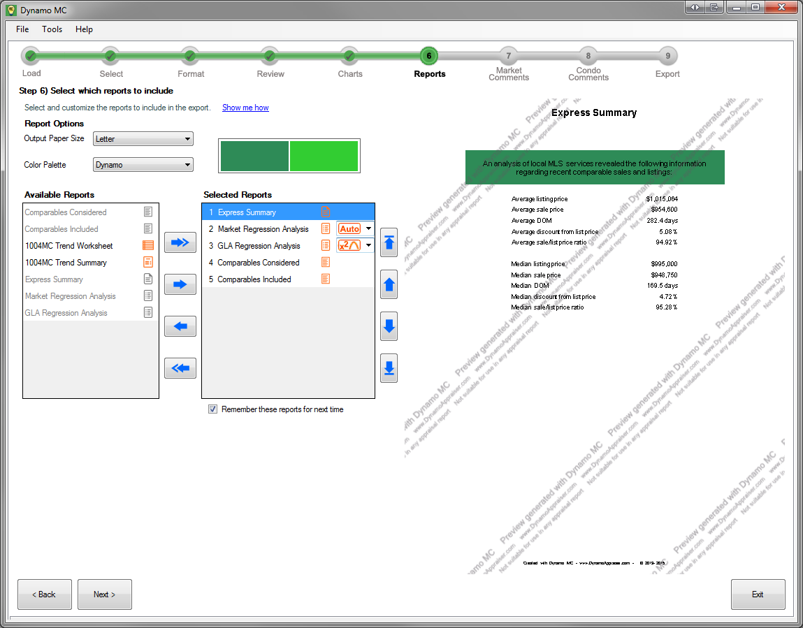 - Includes Dynamic Reports. Dynamo MC™ can also generate a number of predefined reports to include with your appraisal. These include mathematical summaries, a listing of all properties included in the analysis (for when the AMCs call to request this information), and regression analysis using your data. Just like with charts, these are automatically generated for you, and will save you lots of time if you are already having to do any of these yourself.