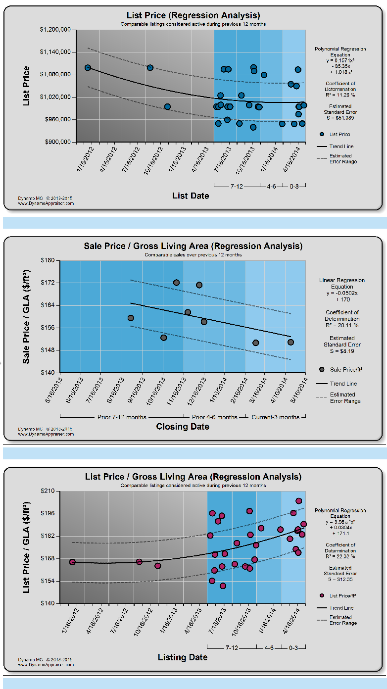 - Performs regression analysis. Dynamo MC™ is able to perform simple linear and polynomial regression analysis on a variety of metrics. The goal is to identify and predict trends among these metrics in your market data. This may even allow you to start taking on assignments that require regression analysis be performed. ( Please note that regression analysis is only a statistical tool, and should not be relied upon to support an appraised value without experience performing regression analysis. This tool should not be used without an understanding of the statistical methods used and the required competency in the market to determine the applicability of the analysis. ) Regression analysis can be performed on the following metrics: