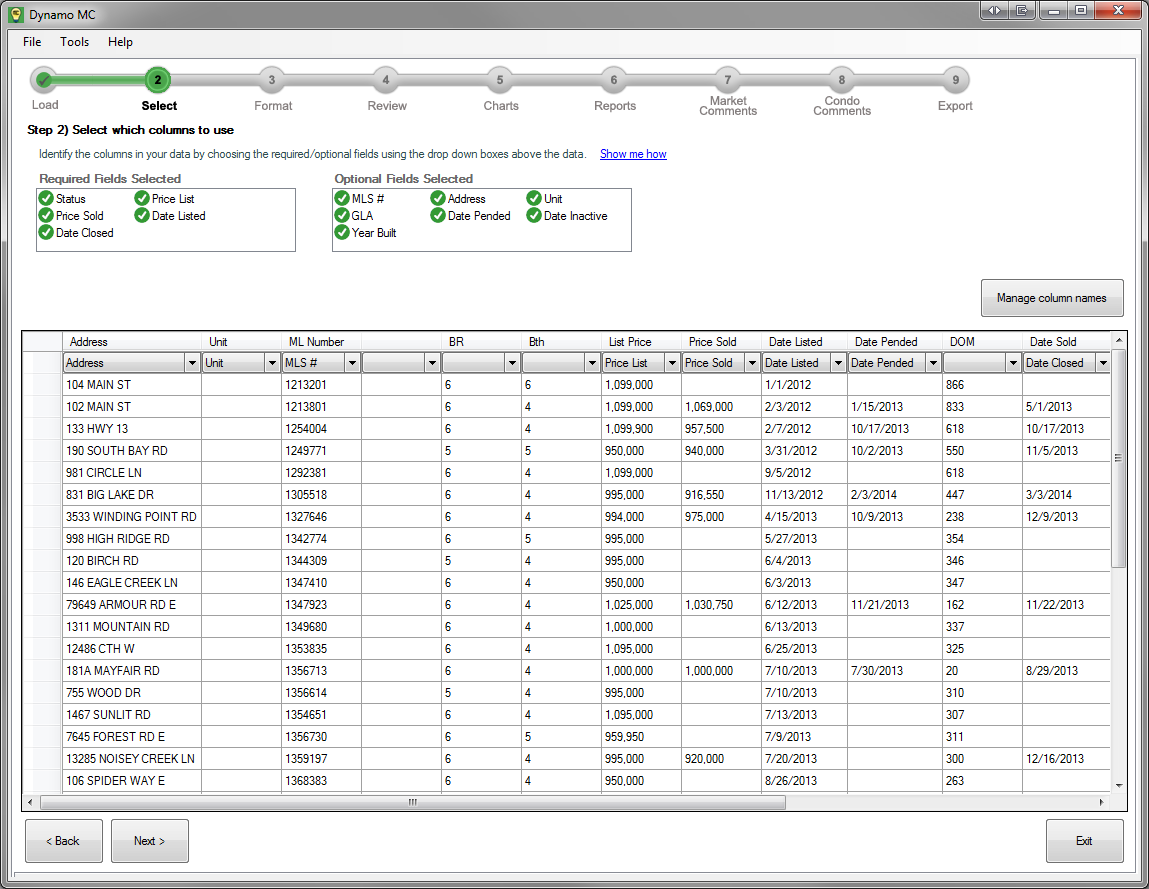 - Learns the column and status names your MLS uses. Dynamo MC™ can identify commonly used names for columns/statuses out of the box. In the event that your MLS uses different names, Dynamo MC™ can learn these and automatically select them in the future so you never have to identify them a second time.
